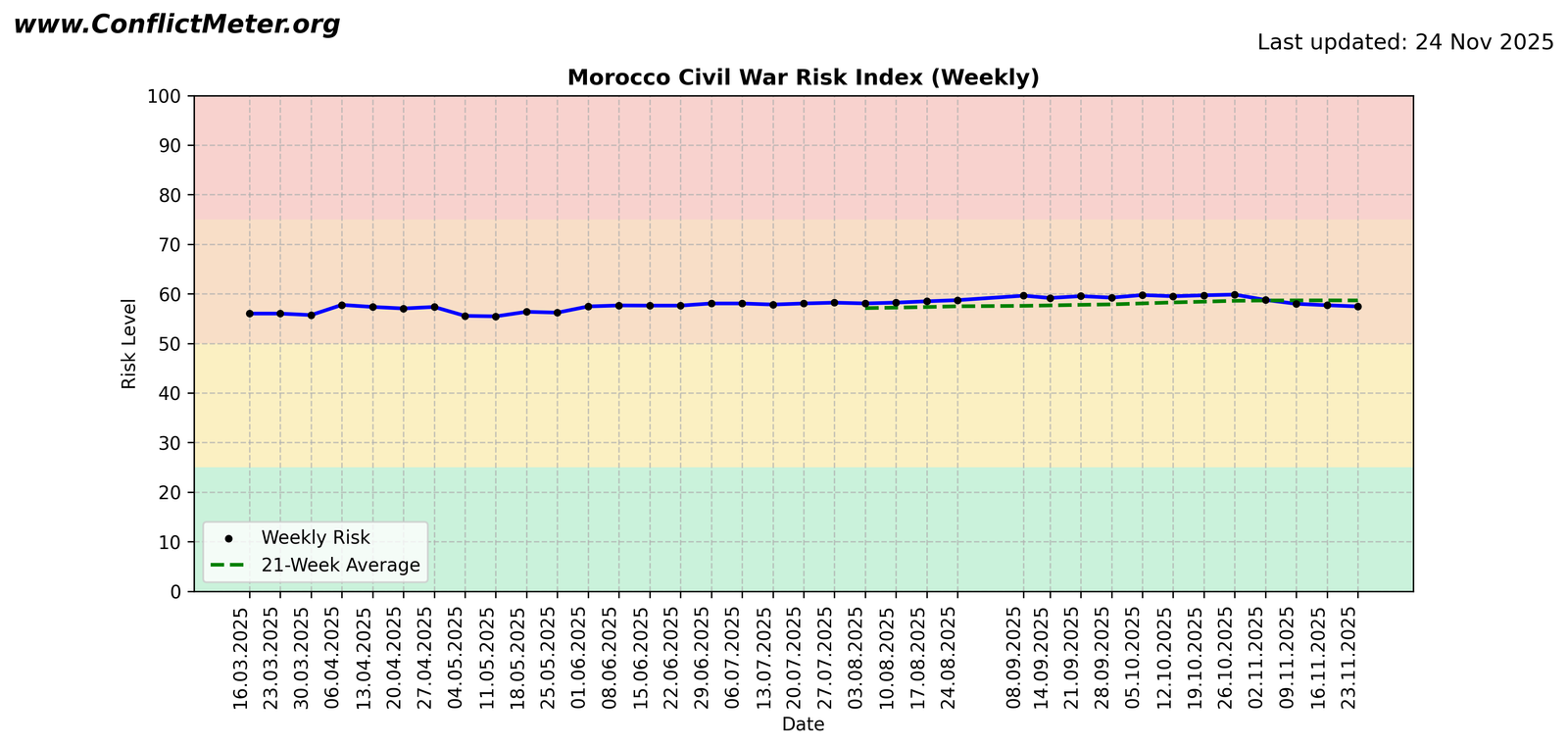 The Civil War Risk Index score for this country is represented by the speedometer gauge above, which is updated daily to reflect the most current data. Below, you’ll find a historical trend chart showing how the risk level has changed over time — this chart is updated weekly.